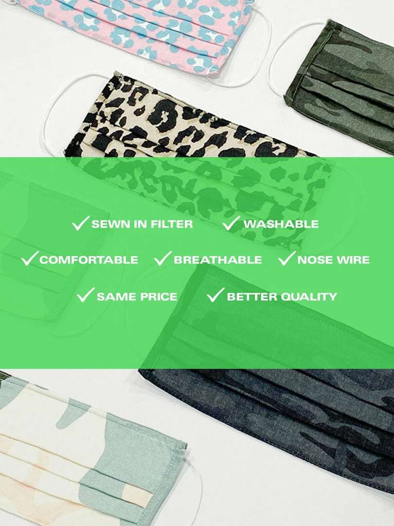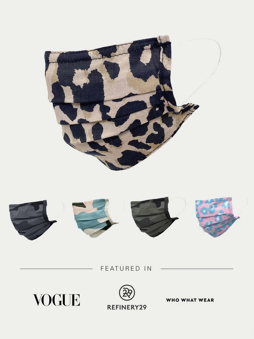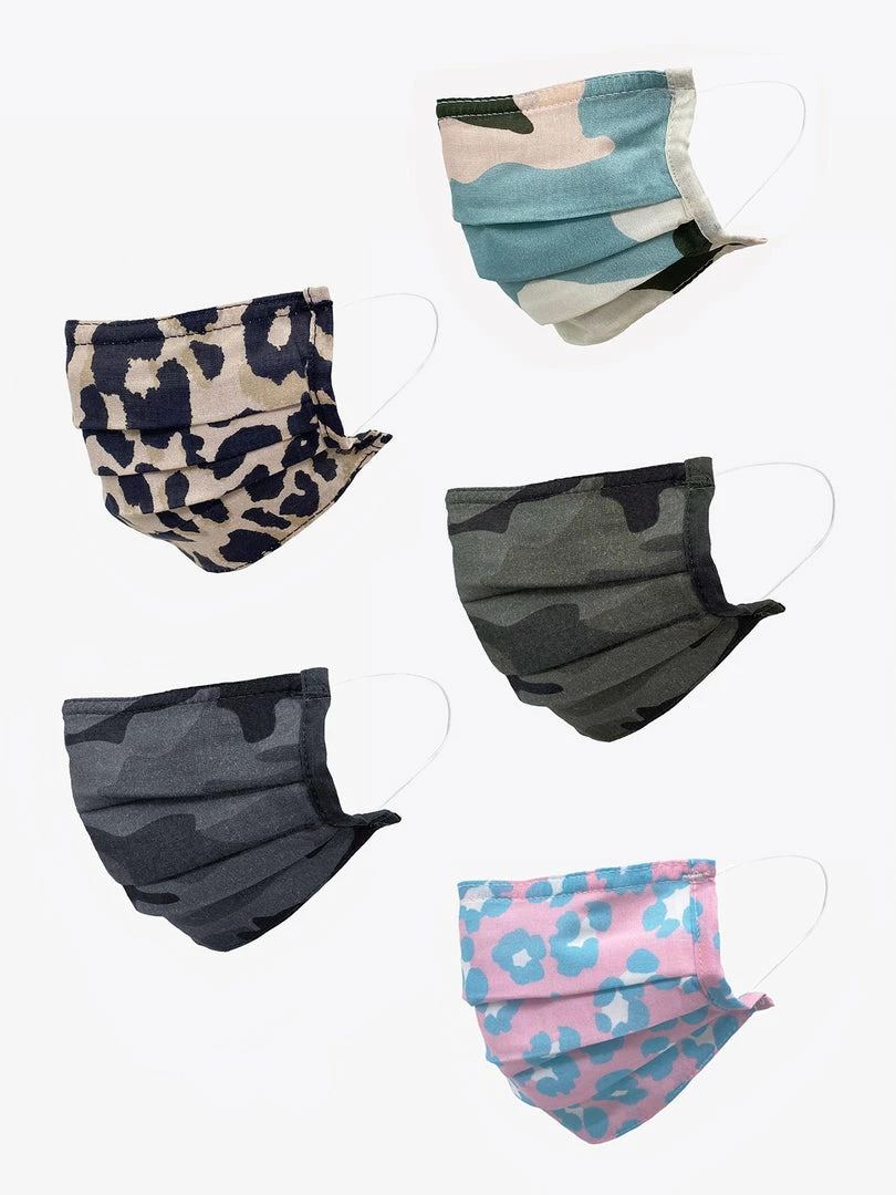 New and improved sewn-in filter. Our Essential Lifestyle Fashion Mask is designed to create a barrier to protect you from the environment around you, while also making you feel confident. This unisex PPE mask comes in an assortment of our stylish signature prints (1 Black Camo, 1 Heritage Camo, 1 Cheeky Camo, 1 Baby Leopard & 1 Classy Cat) as seen on celebrities like Ben Affleck, Ana De Armas, and Alessandra Ambrosio.