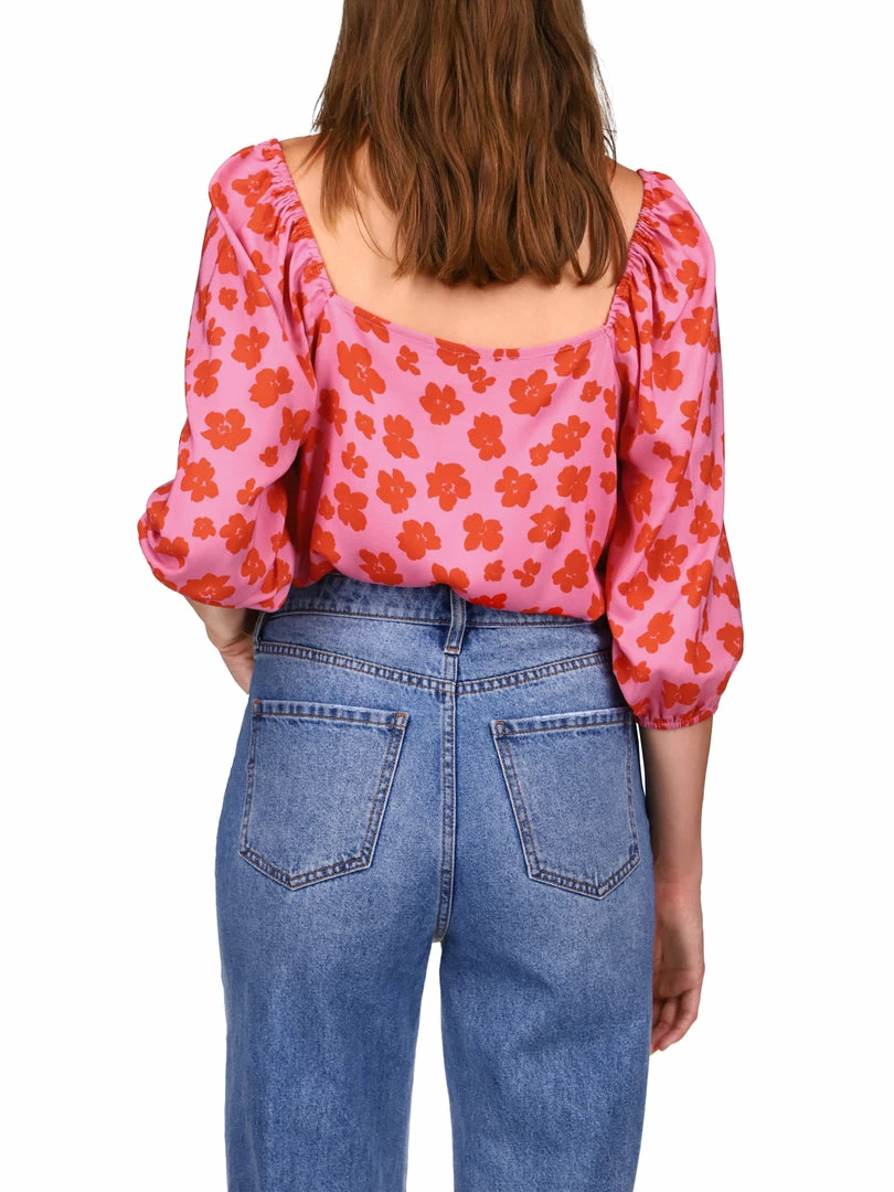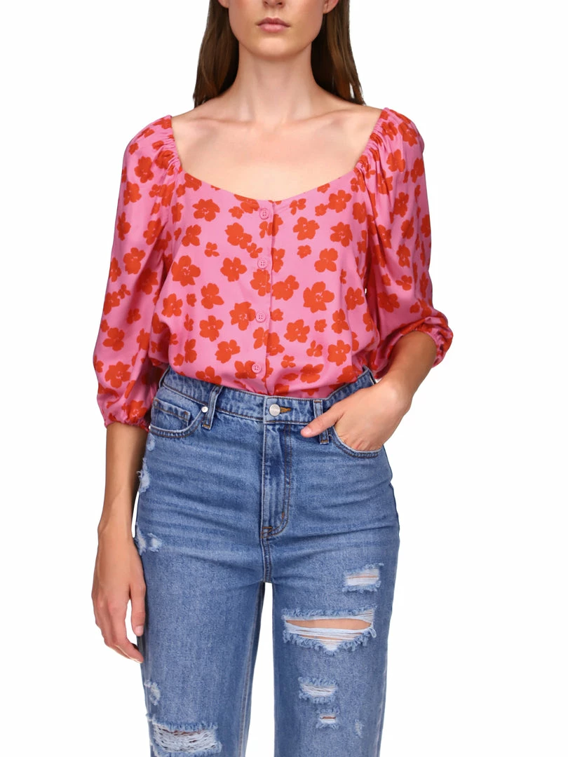 A playful floral print decorates this easy button-front blouse that pairs with everything. A lightweight woven fabric shapes this cute top with a square neckline and three-quarter puff sleeves with elastic cuffs.