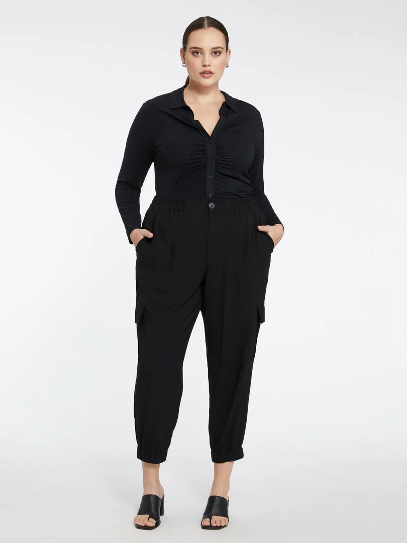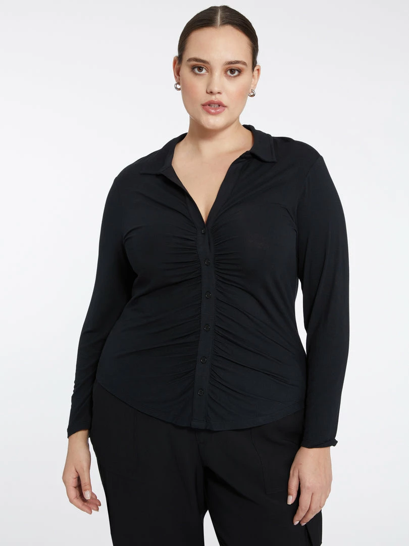 A lightweight slinky knit shapes this slim button-front blouse finished with a deep V and ruched front detail.