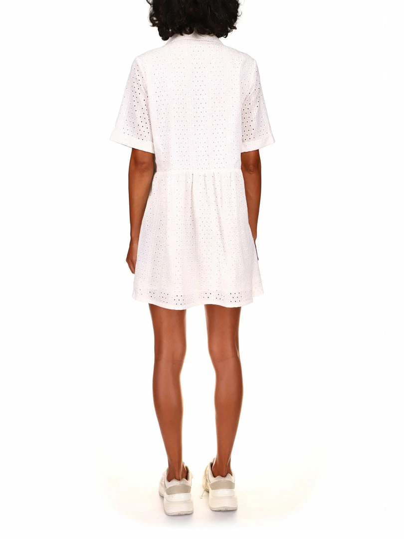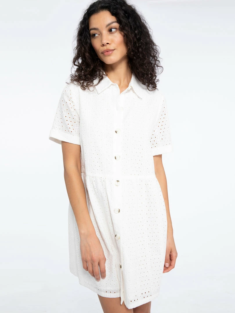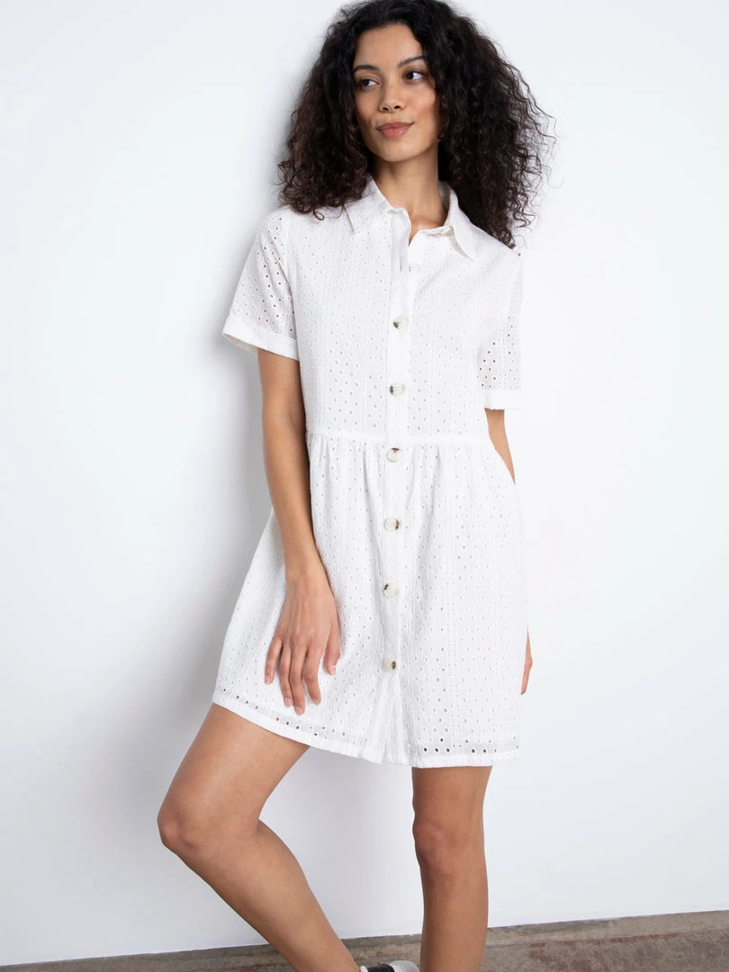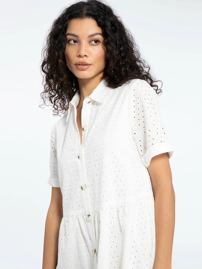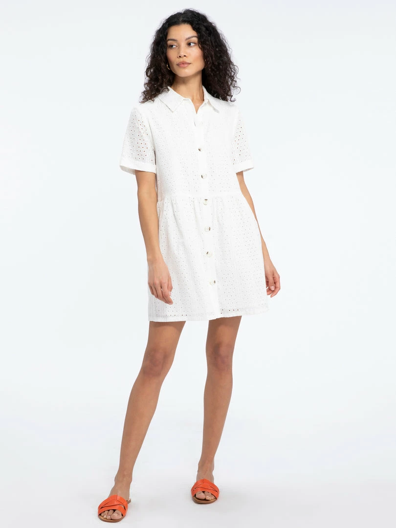 Spring picnics call for this sweet sundress. The Heirloom Shirt Dress will be the cutest dress in your wardrobe with its lightweight eyelet woven structure that shapes a collared neckline, a button front bodice, and short sleeves. Pair this breezy eyelet babydoll with bright-colored sandals for the ultimate warm-weather fit.