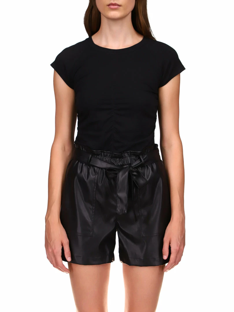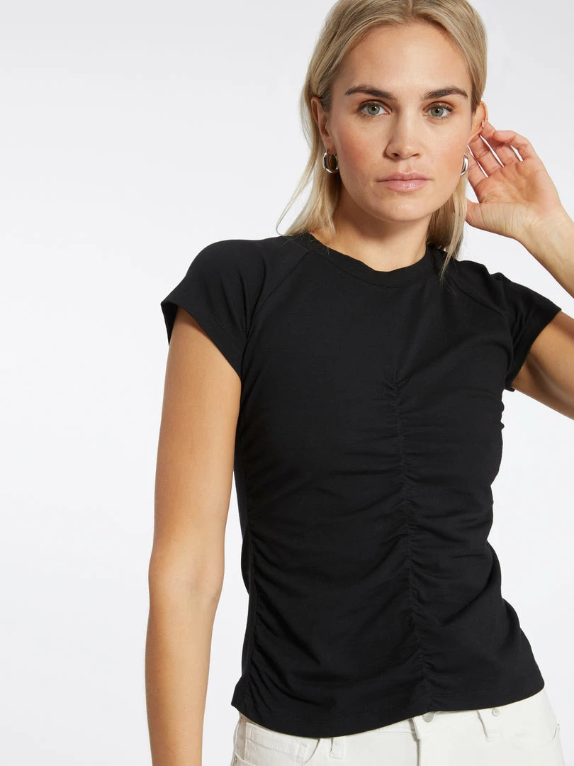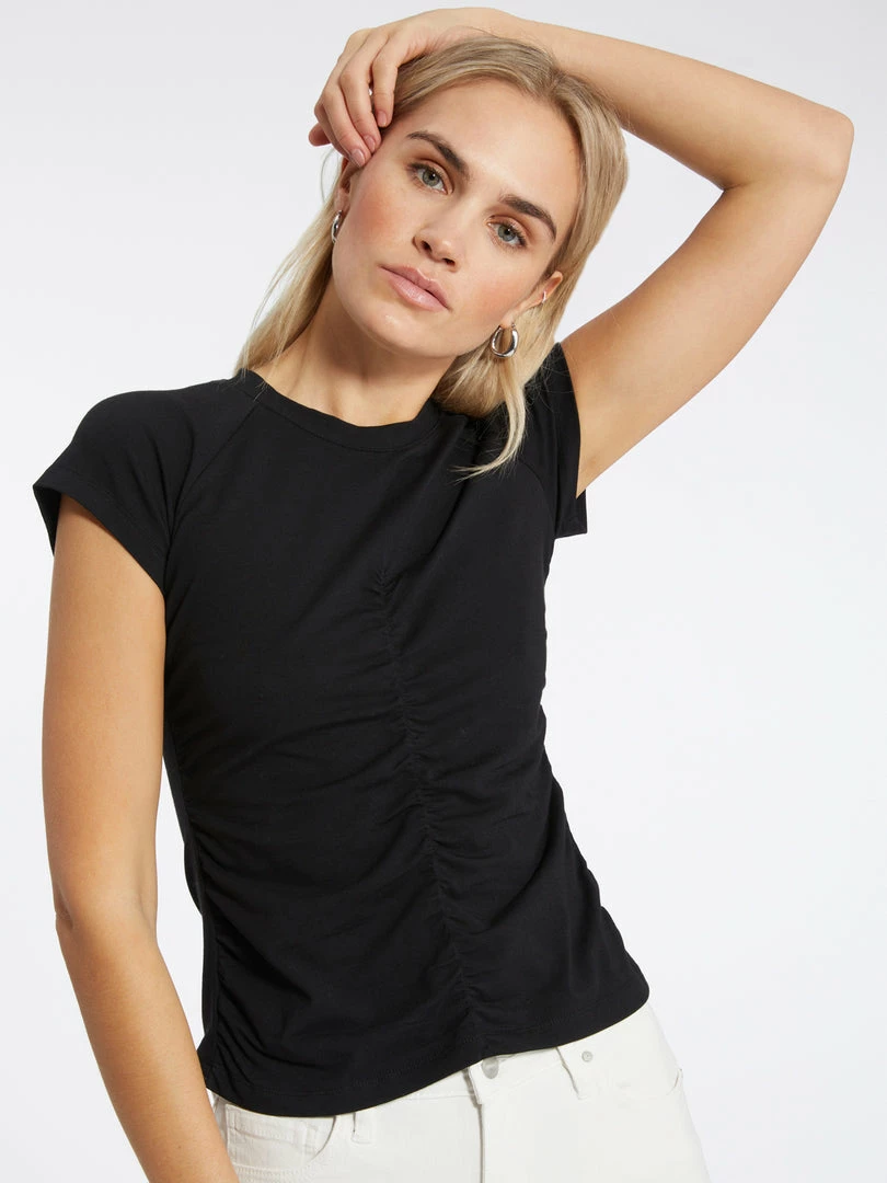 An incredibly soft to the touch Pima cotton blend shapes this everyday tee. The rippled ruching down the front adds a modern charm to a form-fitted silhouette that hits along the hips.