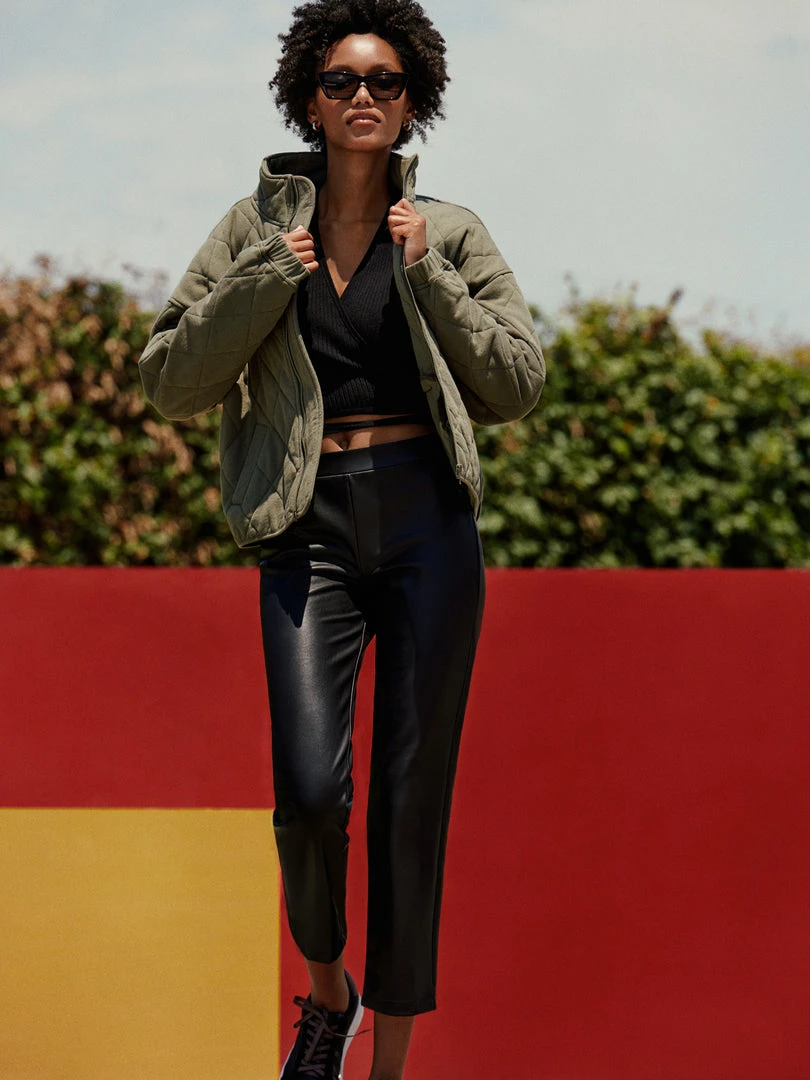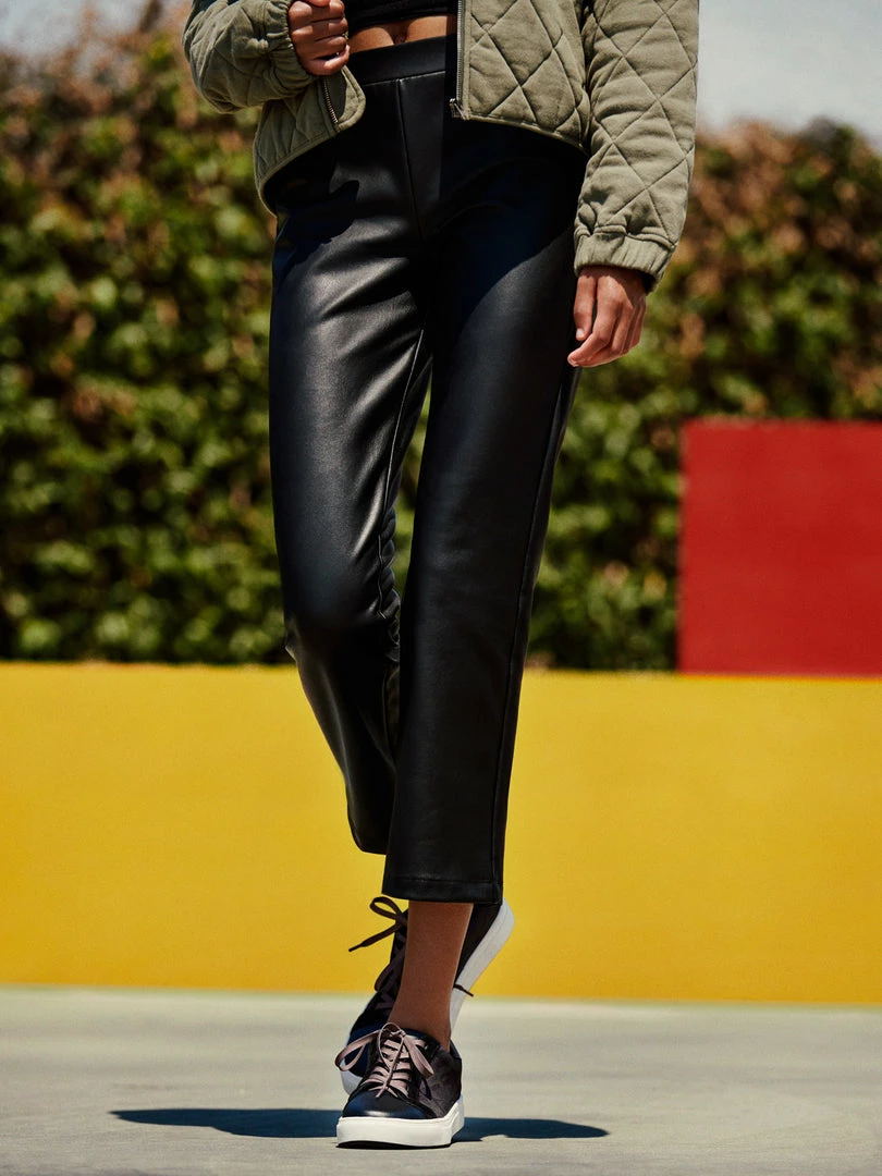 A black leather-like cropped pant featuring a straight leg; the ideal base for all your cold-weather looks.
