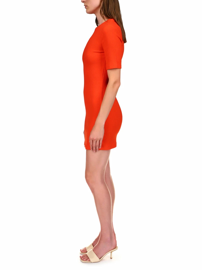 A lightweight stretchy ribbed knit forms this classic mini dress that features a crew neck and bodycon silhouette.