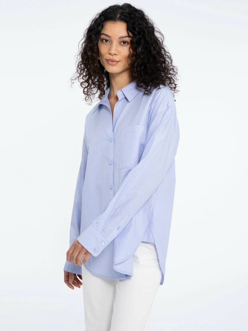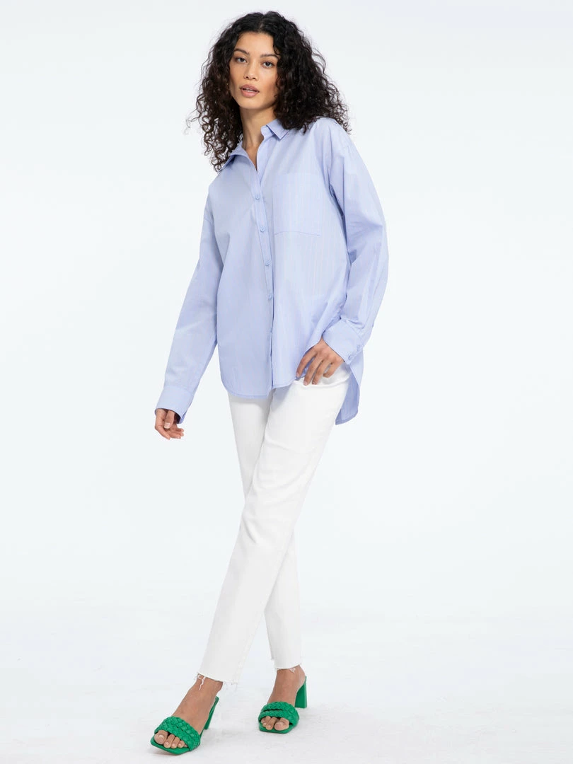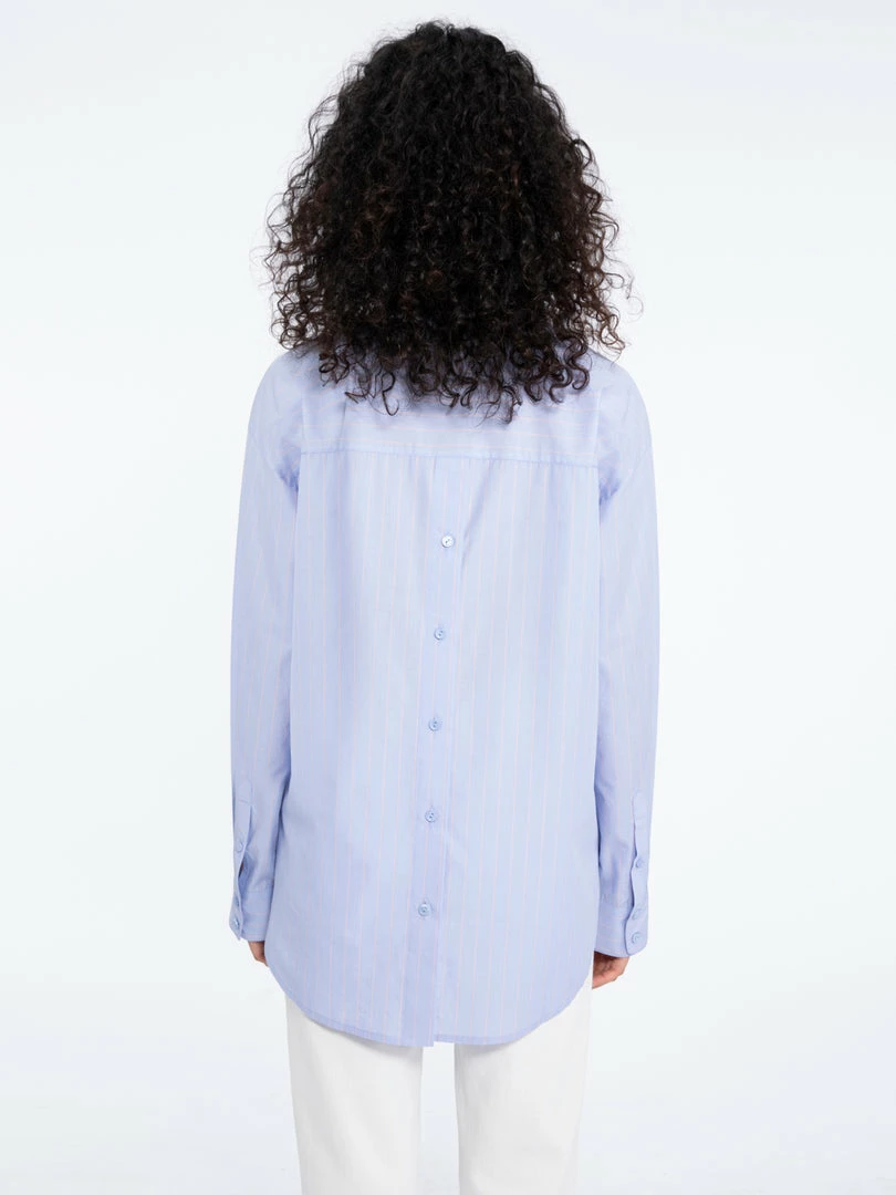 Sanctuary’s Open Back Tunic can effortlessly go from the office to after-hours. Lightweight woven fabric, with a subtle striped pattern, shape this cute blouse with a collared neckline and long, cuffed sleeves. A relaxed bodice, with a full button placket down the front and back, tucks perfectly into your favorite high-waisted bottoms or can be knotted in the front for a stylish twist.