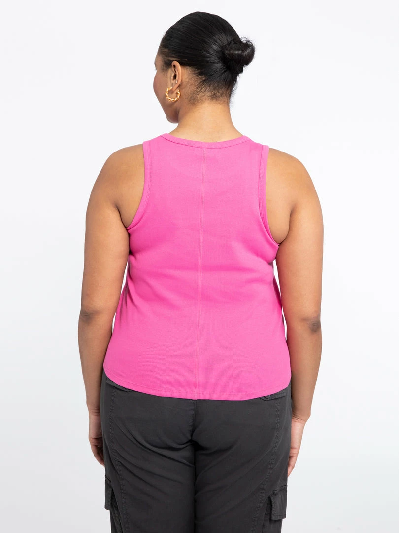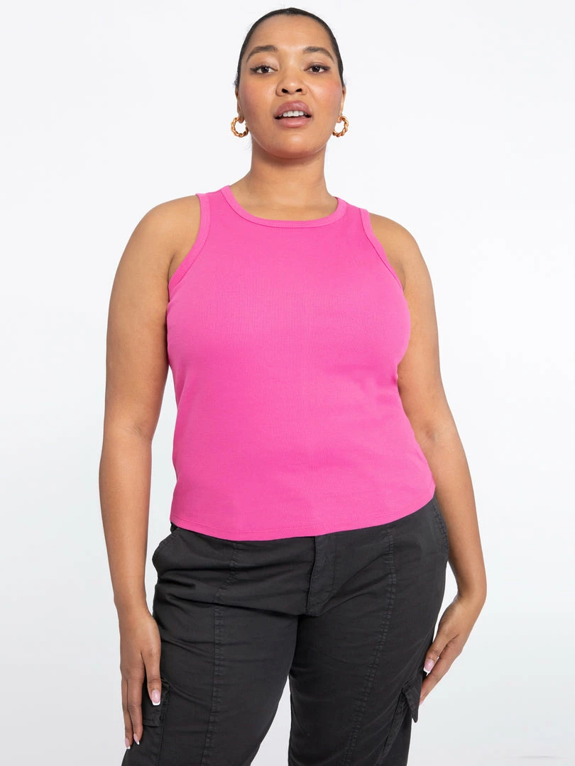 A soft halter tank cut from a ribbed cotton fabric that hugs your curves with just a touch of stretch.