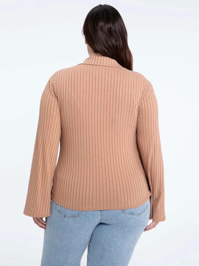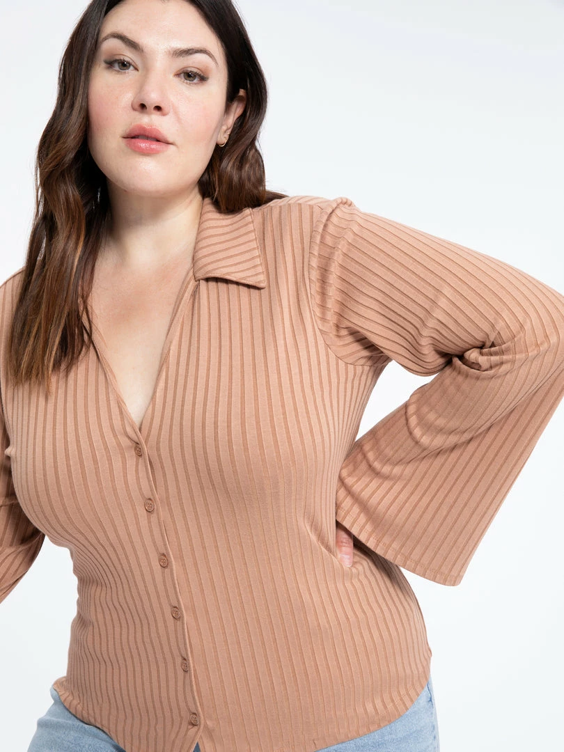 A super soft and stretchy rib knit shapes this trendy button-down with a classic collar and playful bell sleeves. Pair this top with our new denim collection and your favorite heels for an elevated look.