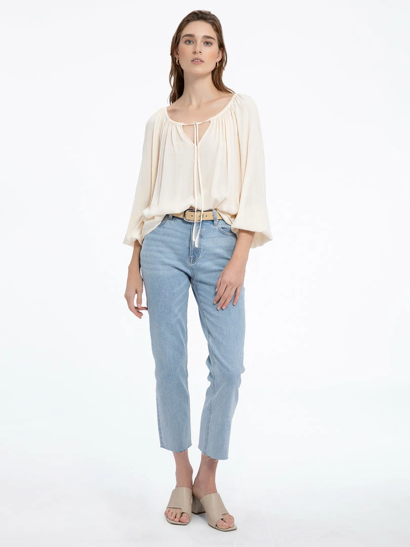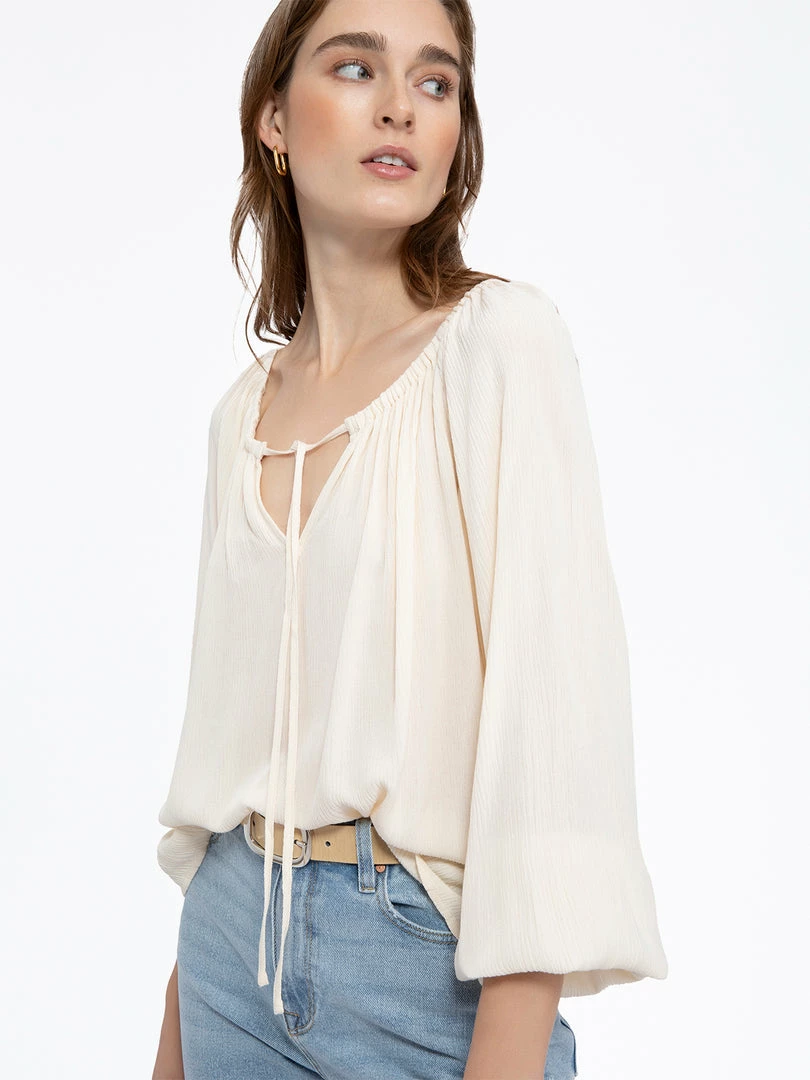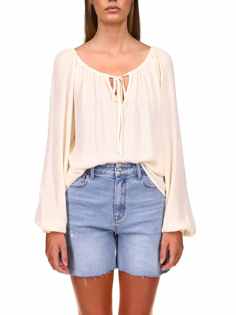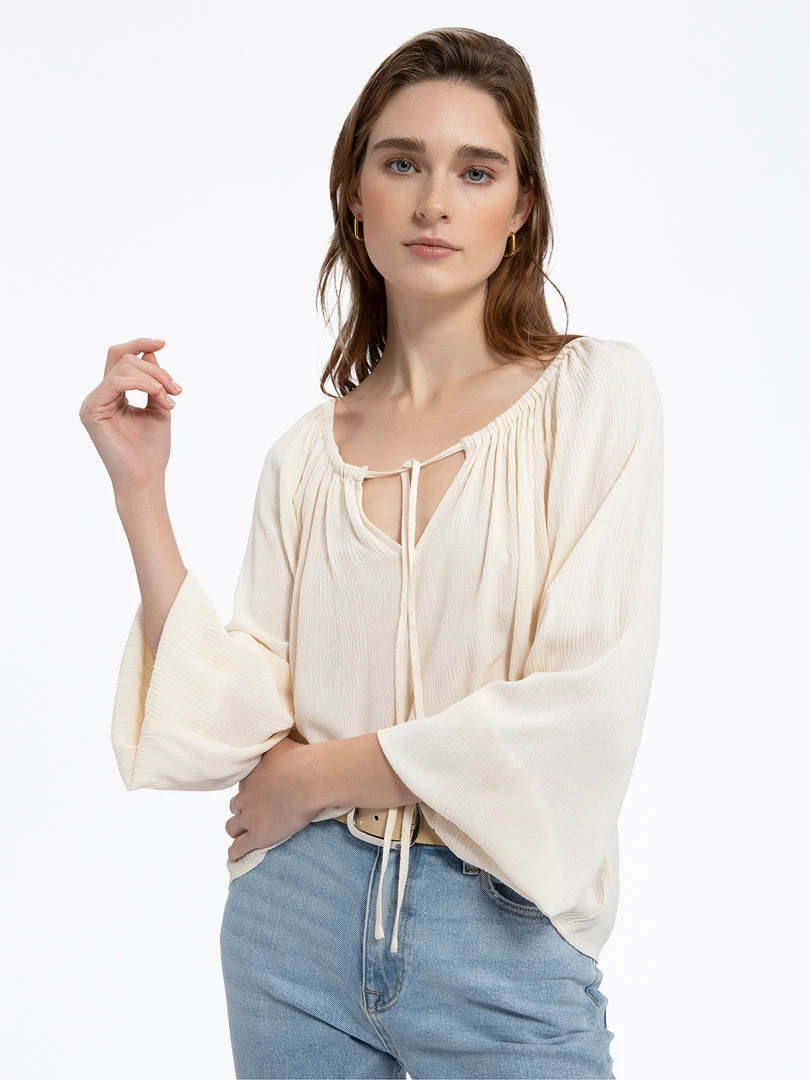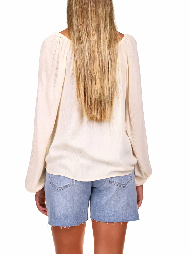 A crinkle crepe fabric shape this light and breezy, boho style blouse. Dainty ties hang from the neckline and can easily be worn off or on the shoulder.