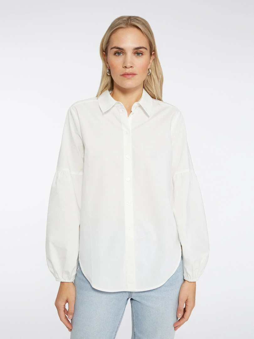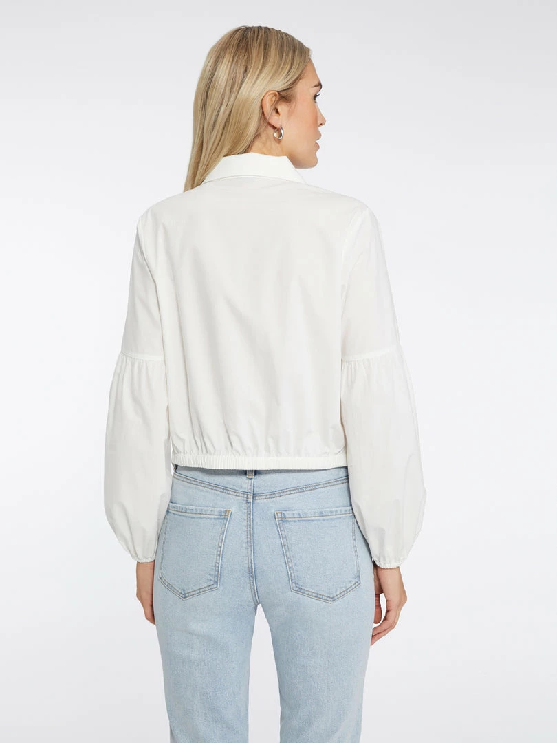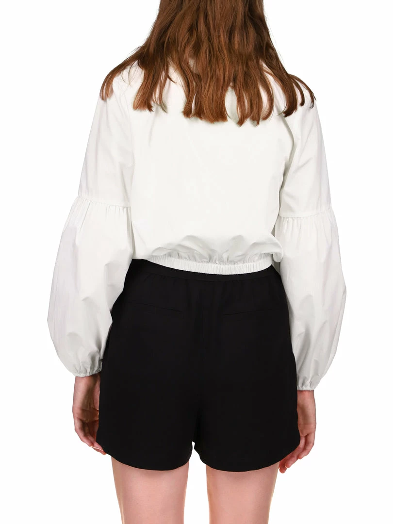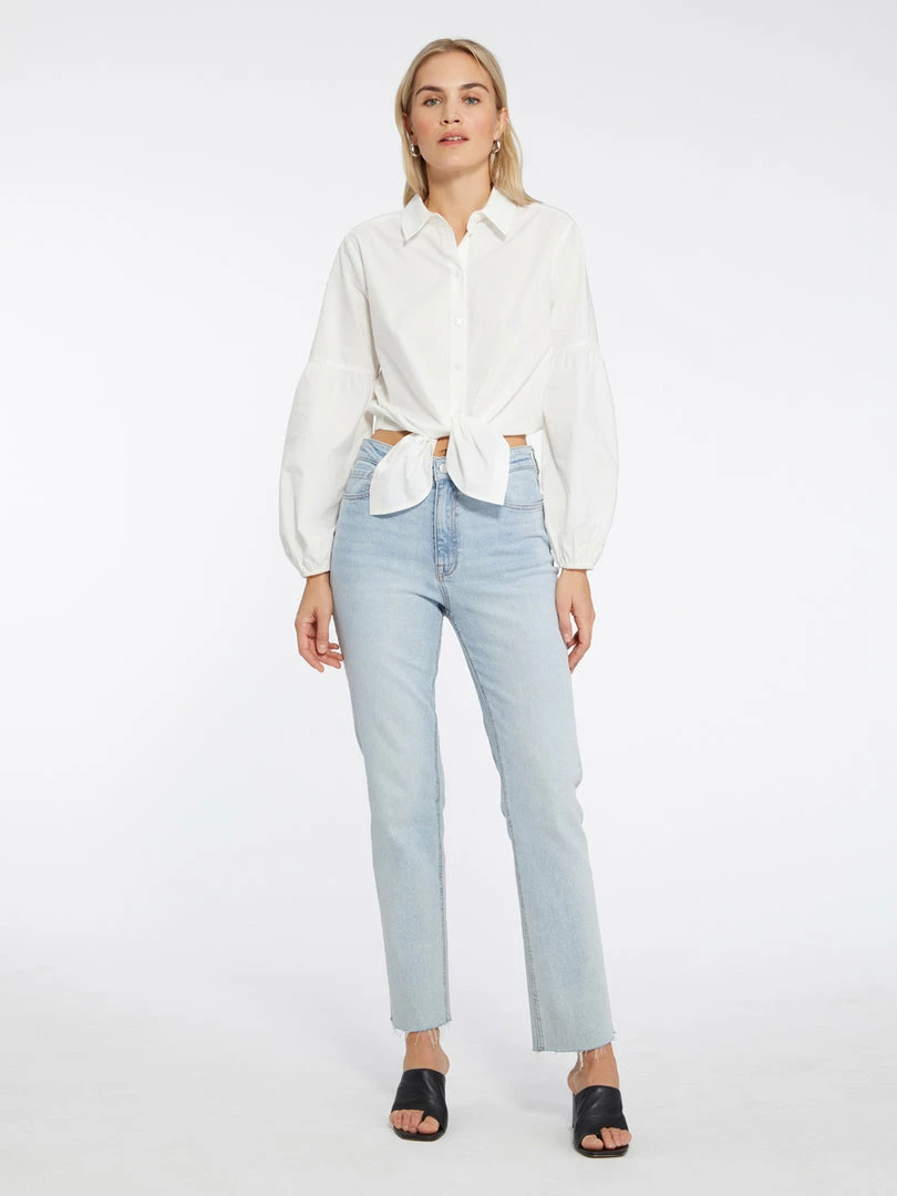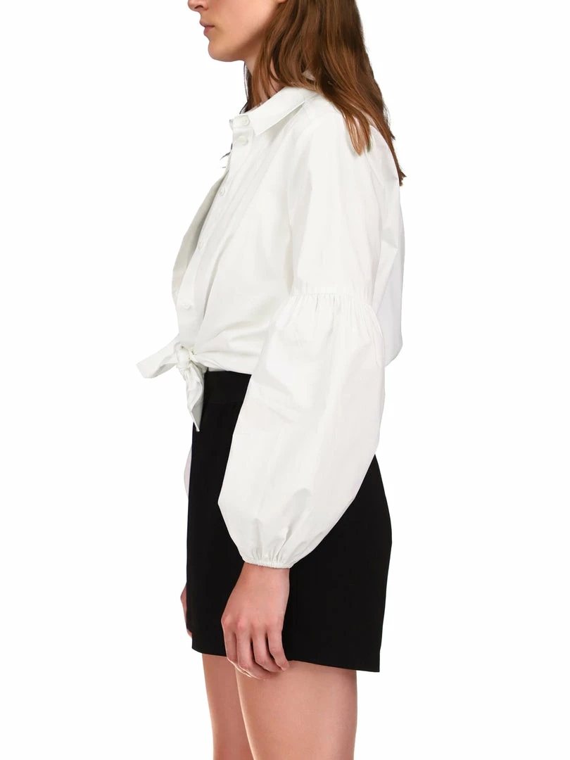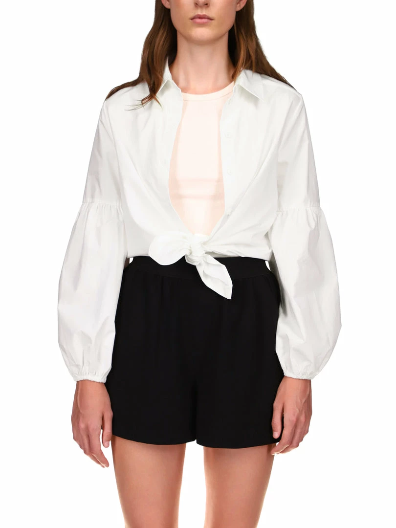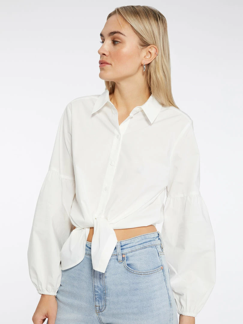 Our Take Two Shirt is everything you could want, and more. Lightweight woven fabric shapes this crisp white button-down top that has a tie front with a cinched back, and long exaggerated sleeves with elastic cuffs.