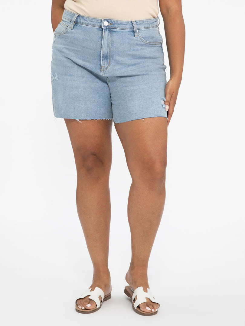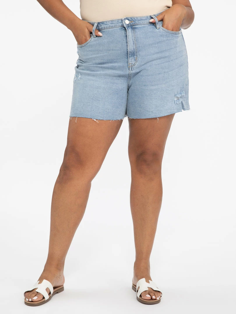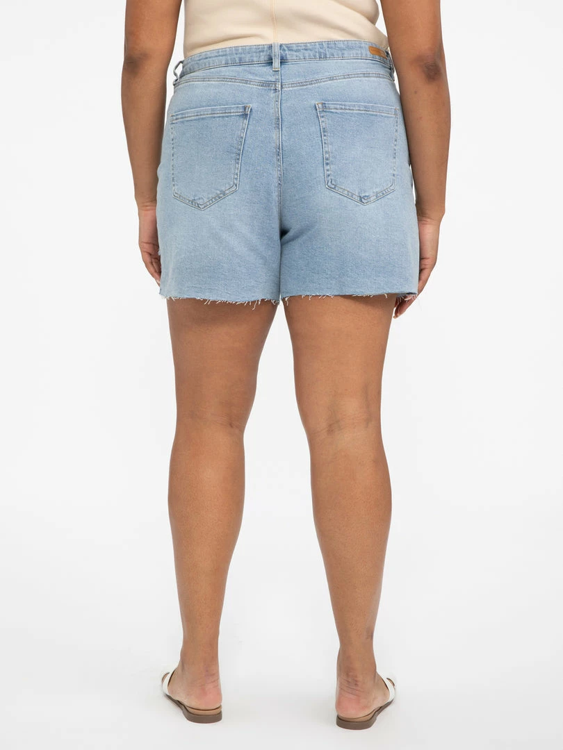 Get your hands on the latest trend of the season with our Sidewalk Ridged Jean Short. Light wash stretch denim shapes these shorts complete with a highrise waist and classic five-pocket cut. These slightly easy-fit bottoms feature whiskers with minimal distressing that end at frayed cutoff hems.