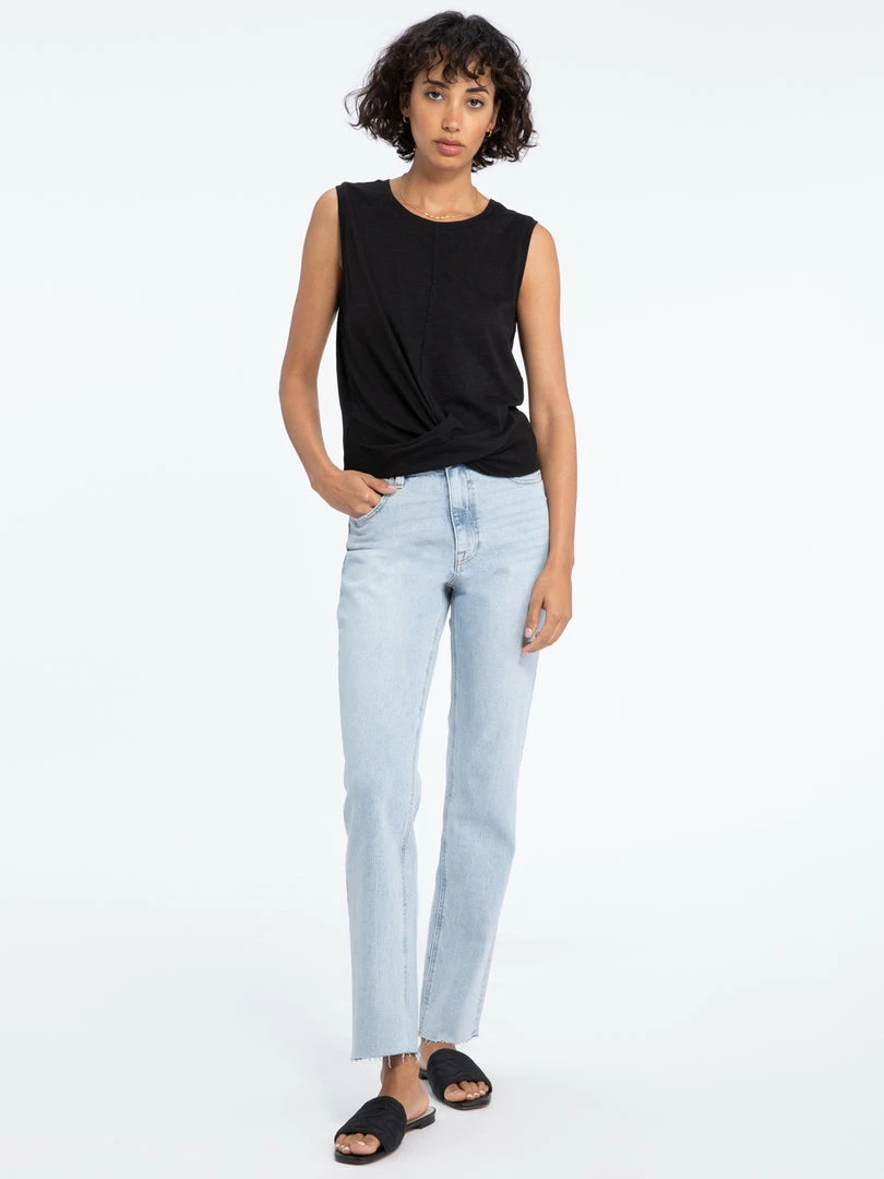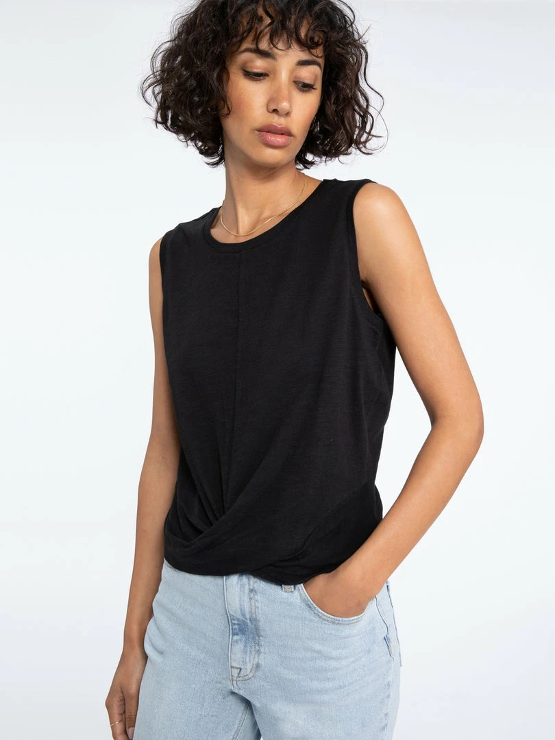 Meet your new warm-weather staple. Lightweight cotton slub shapes this loose-fitted, sleeveless tank. A basic crew neck ends at a twist front hem for a playful touch. Finish the look with your go-to denim cut-offs and colorful sandals.