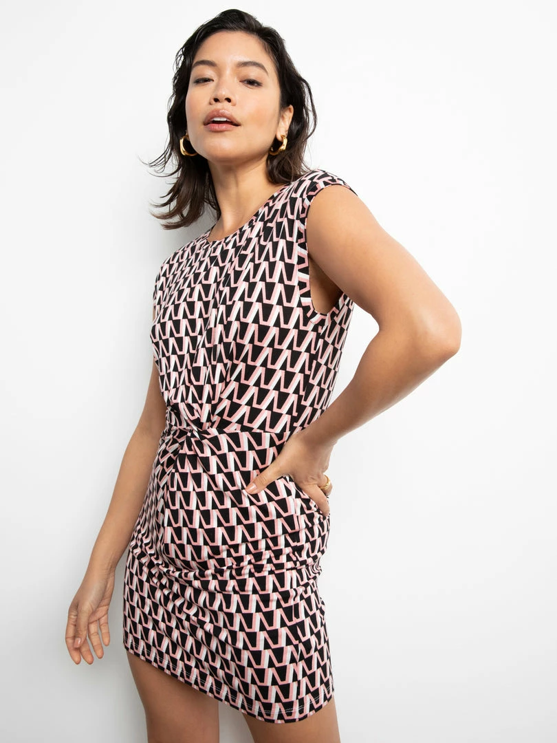 We’ve taken the classic t-shirt dress and transformed it into a fashion icon’s dream. This body-skimming t-shirt dress is fabricated with a lightweight slinky knit. A bold geometric pattern and twisted knot at the side add to the appeal.