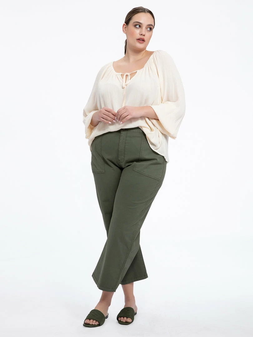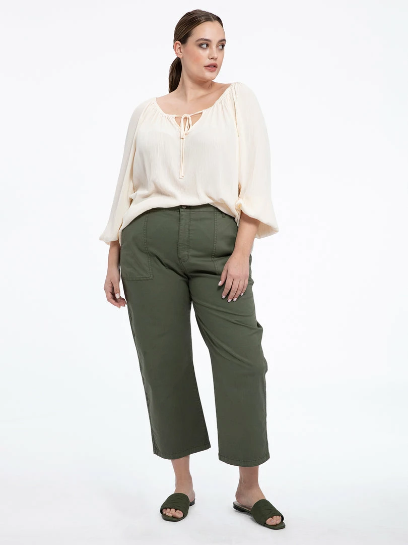 Get ready to take on every adventure in style with the Vacation Crop. Inspired by an authentic surplus pant, a woven crepe fabric shapes these wide-leg cut bottoms that have a high-waisted fit with belt loops and functional front and back pockets. The Vacation Crop features an easy silhouette and hits just above the ankle with a slightly cropped leg.