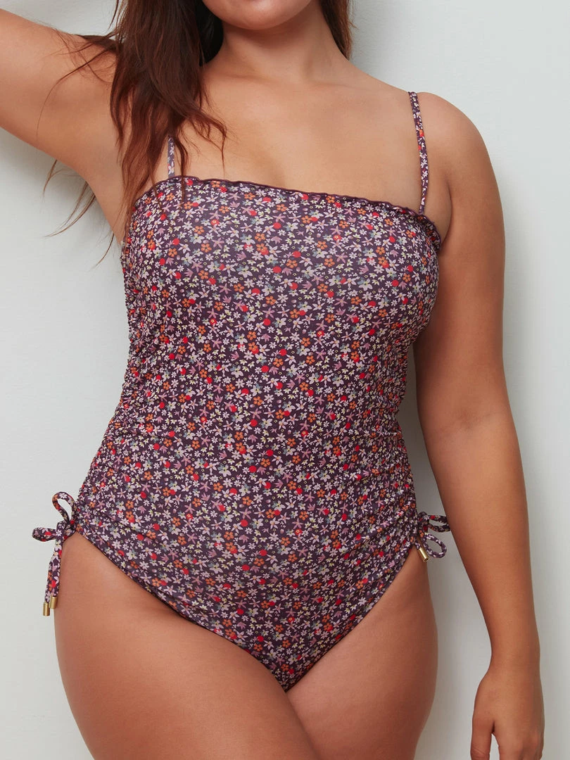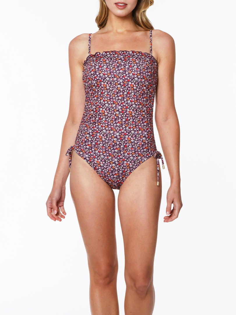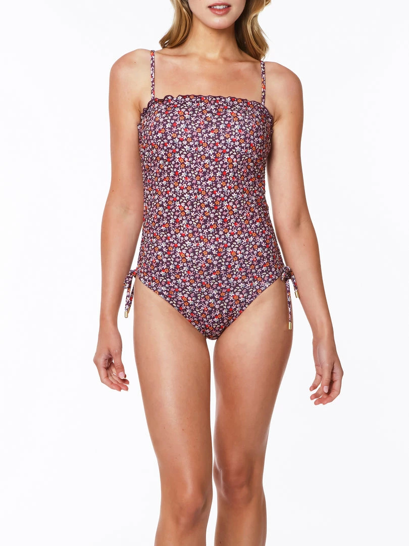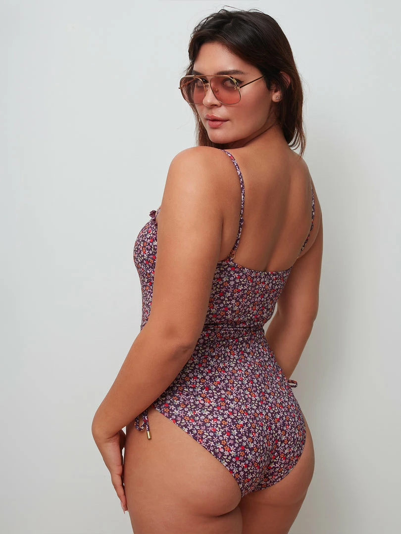Shirred side detailing smooth and flatter your figure in this lively one-piece. A flirty ruffled neckline and high-cut leg ties add additional flair to this floral swimsuit.